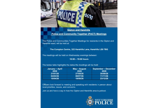 Gipton and Harehills Neighbourhood Policing Teams have announced the Police and Community Together Meetings for 2026.