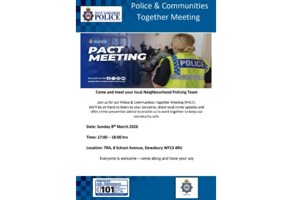Join us for our Police & Communities Together Meeting (PACT). We’ll be on hand to listen to your concerns, share local crime updates and offer crime prevention advice to enable us to work together to keep our community safe.