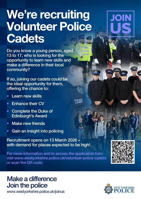 Want to become a Police Cadet? Applications open 13 March 2026! Are you 13–17 and looking for a new challenge? Join our Volunteer Police Cadets! Make friends, learn new skills, help your community and work towards your DofE Awards. The next programme runs Sept 2026 – July 2028. To apply, you must live in West Yorkshire, be in Year 9+, and have parent/guardian consent.